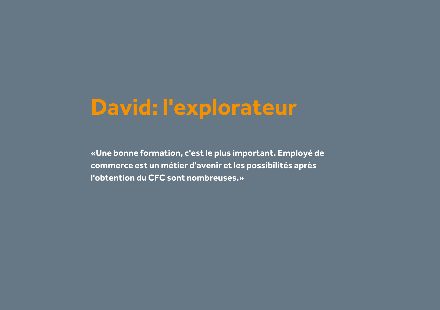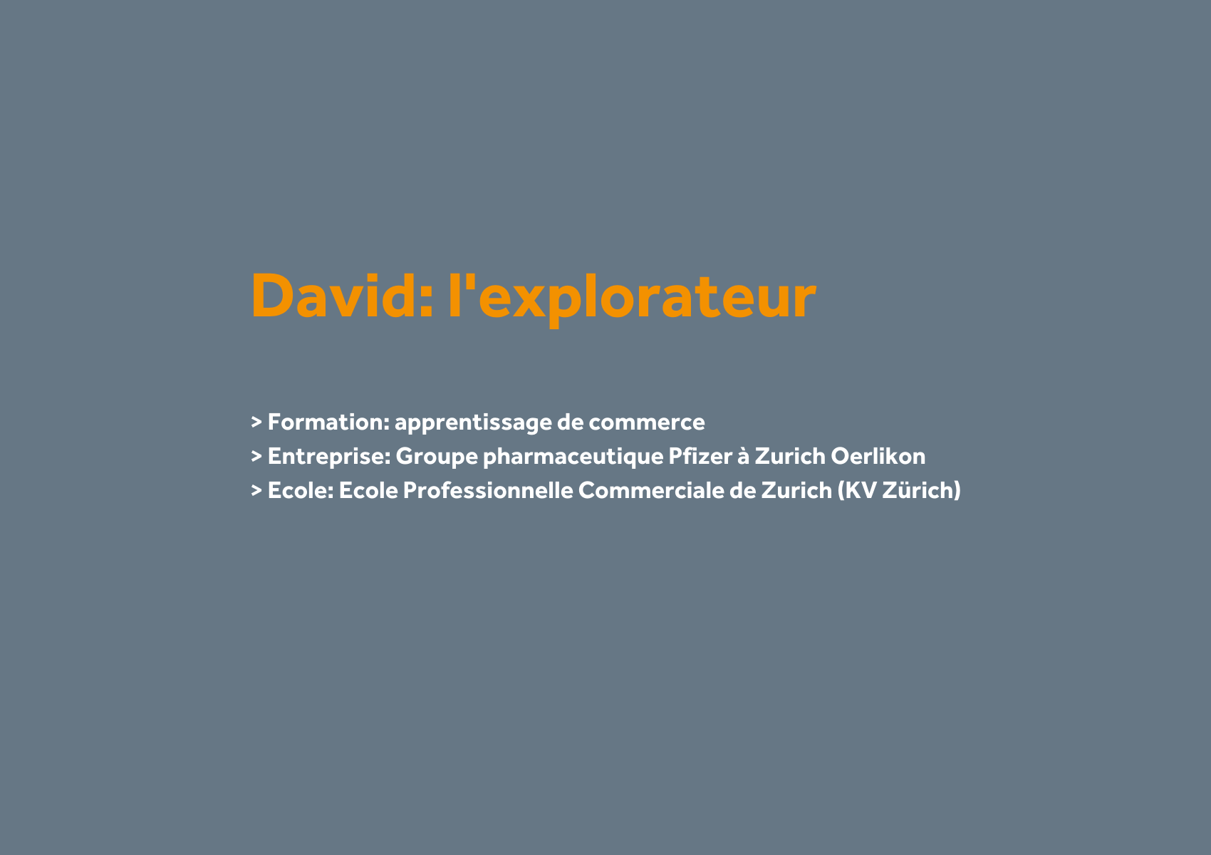 David apprécie le contact avec ses collègues de Pfizer et la grande variété de son apprentissage de commerce. À l'école, il doit davantage réviser qu'auparavant. Il compte d'ailleurs améliorer ses notes au deuxième semestre.