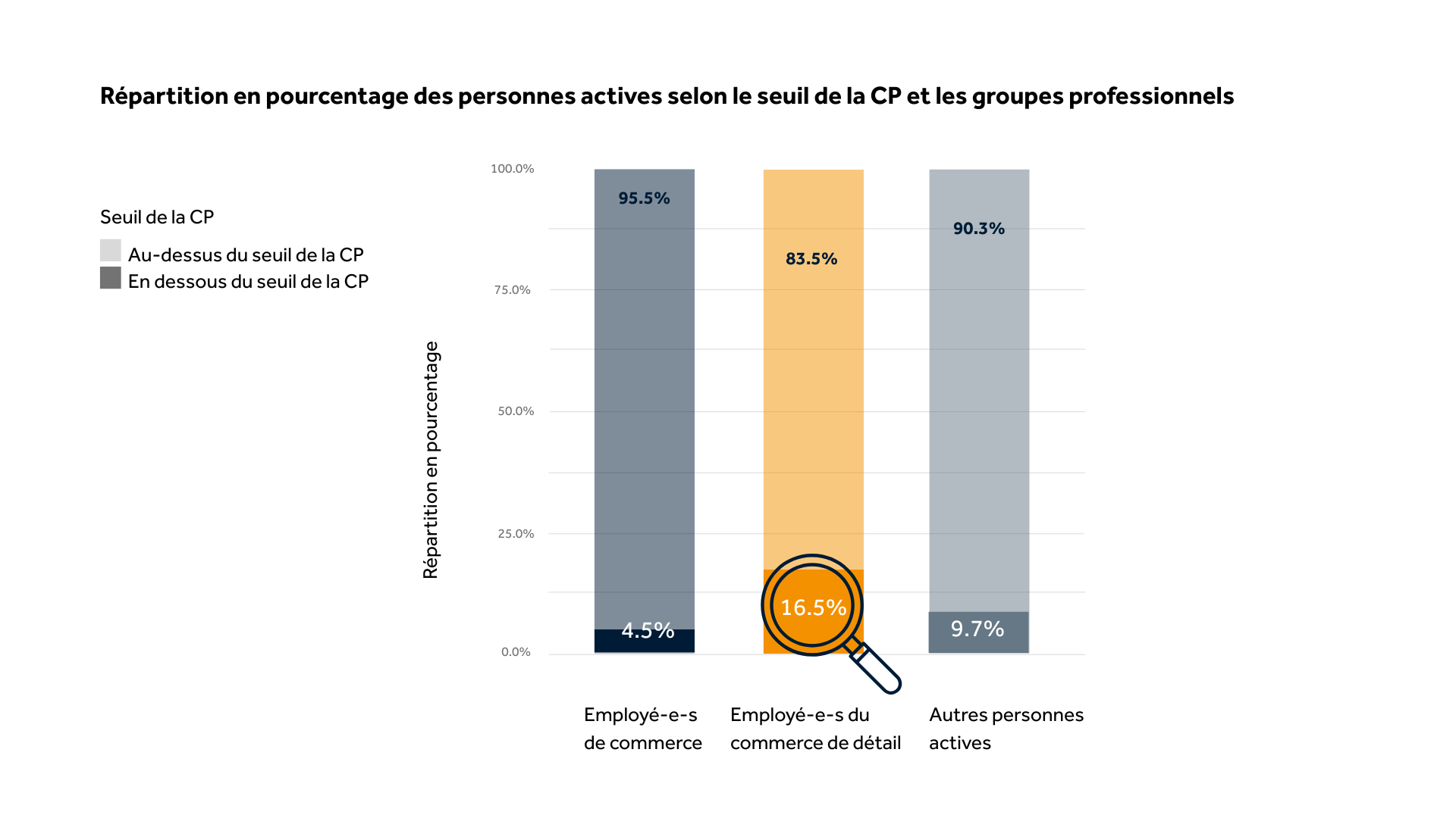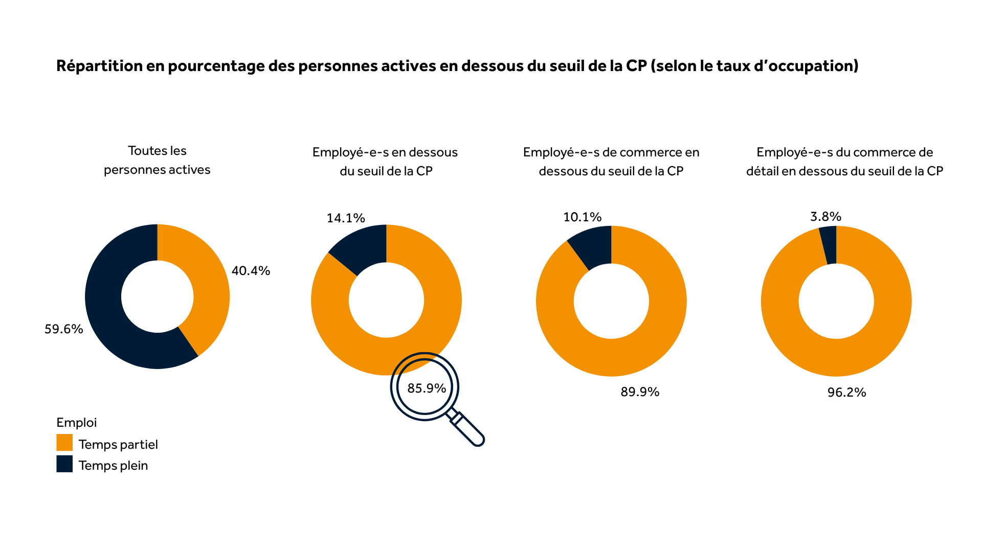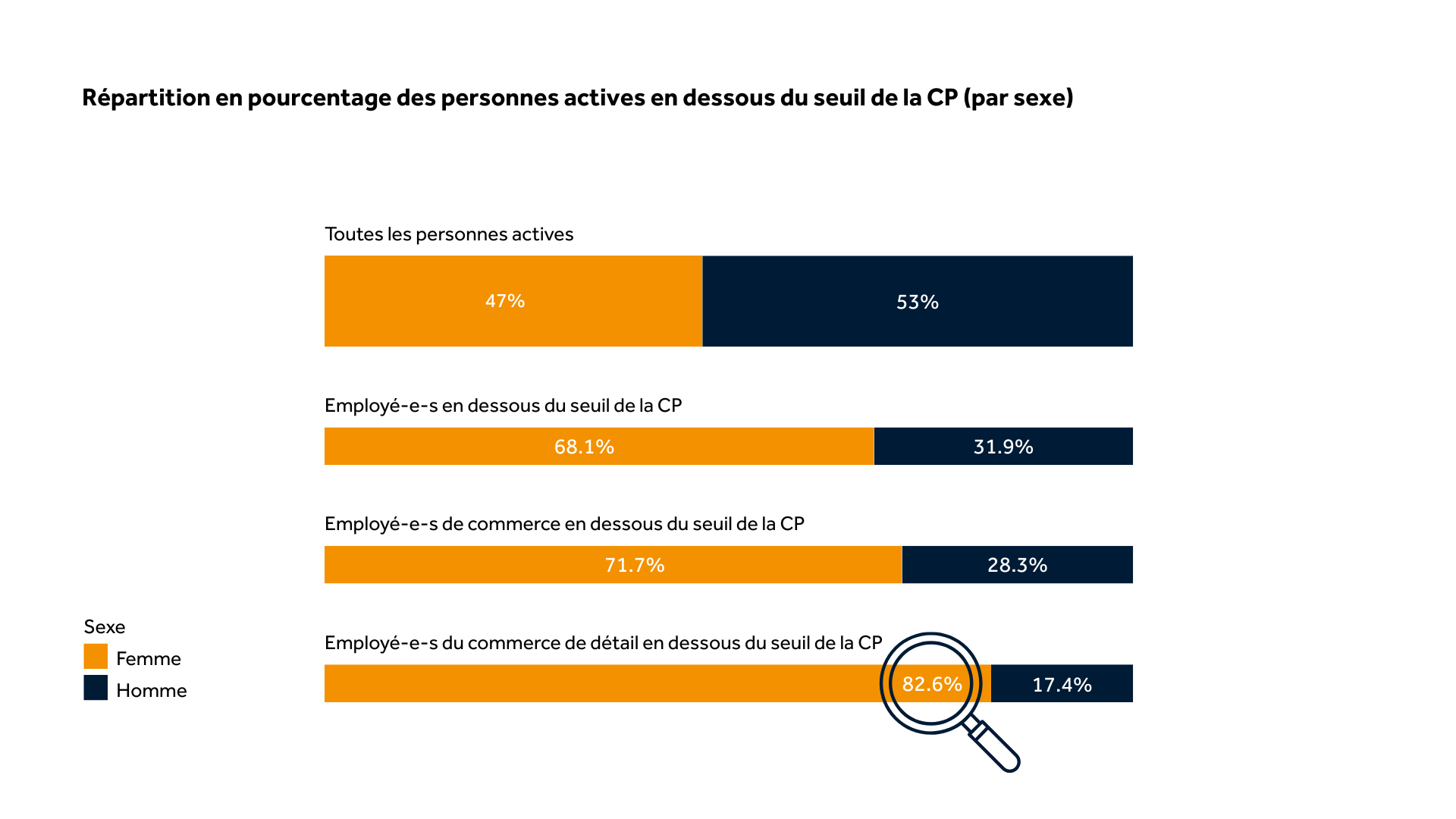 Les femmes travaillent plus souvent que la moyenne à temps partiel; selon l’Office fédéral de la statistique (OF), presque trois fois plus que leurs collègues masculins. Or, la majorité des femmes qui travaillent à temps partiel et qui se trouvent en dessous du seuil d’entrée de la CP ne le font pas volontairement: les obligations familiales, comme les soins à la personne, obligent beaucoup à adopter des modèles de travail flexibles qui ne permettent qu’une prévoyance vieillesse limitée, voire insuffisante. Dans le commerce de détail, la proportion de femmes se trouvant en dessous du seuil d’entrée à la CP est même supérieure à 80%.